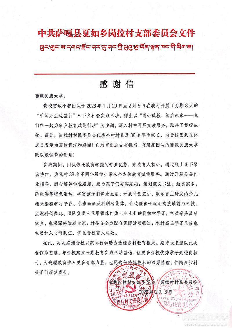 感谢信中,岗拉村对本次公益支教活动给予一致好评。对支教团队的辛勤付出与扎实工作表示感谢,高度肯定我校青年学子扎根边疆、服务家乡的责任担当,彰显我校的卓越育人成效。期望未来与我校进一步深化校村合作,建立长期教育实践基地,让更多民大优秀学子走进岗拉村,为边疆教育注入青春力量。