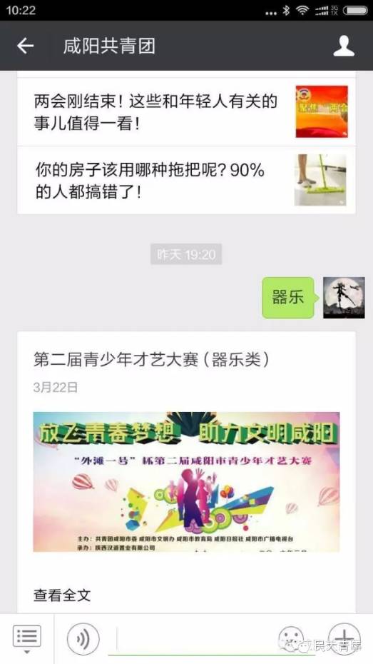 本次大赛分为“器乐、声乐、舞蹈、语言”四类,给“咸阳共青团”微信公众号回复对应的类型即可跳出报名页面。例如,想参加器乐比赛的朋友,请回复 :器乐